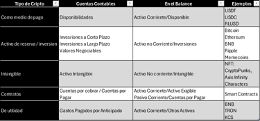 Otra clasificación que vale la pena mencionar es de acuerdo con el uso en de los cripto activos dentro de la empresa. A continuación una clasificación resumida de como podría apropiarse contablemente los criptos.