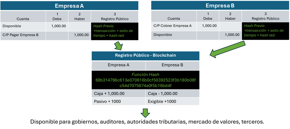 ¿Cómo Funciona la Contabilidad de Triple Entrada? La imagen A ilustra su funcionamiento de manera muy simplificada. La imagen B ilustra a mayor detalle la tercera entrada y el registro público.